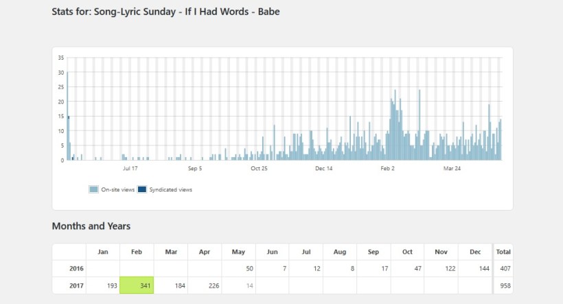 Of all the posts I’ve written that might have seen a lot of traffic, I didn’t suspect Song-Lyric Sunday – If I Had Words – Babe would be the one. But for some strange reason, it is.