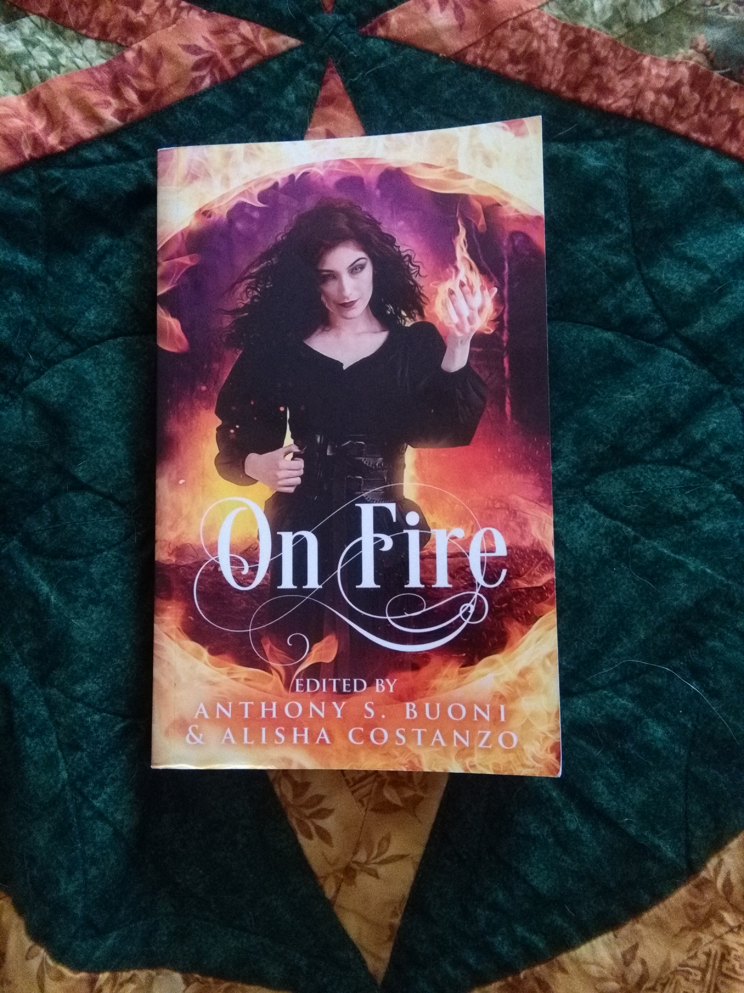 Moving into a much more comfortable spot (in more ways than one), I looked around and found that my copy of On Fire was the closest thing to hand. I opened it to a random spot, which happened to be Alisha Costanzo’s story, “The Mark of the Phoenix.” I wish I could tell you what it’s about, but I haven’t had time to read it yet. It’s a lovely book, though; one of my own stories is in it. 😀