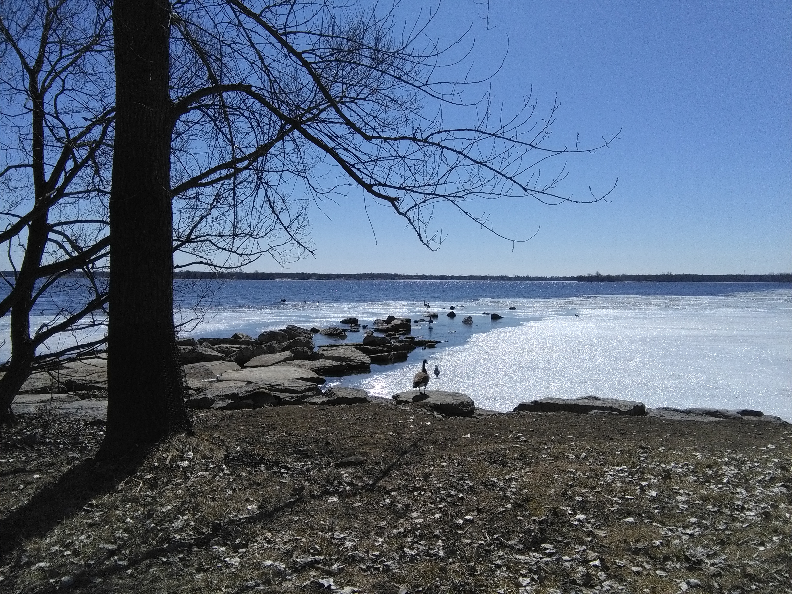 Chilly day for a swim, so why not walk on the water? (Hint: take a closer look at the photo. One goose appears to be standing on the water.)