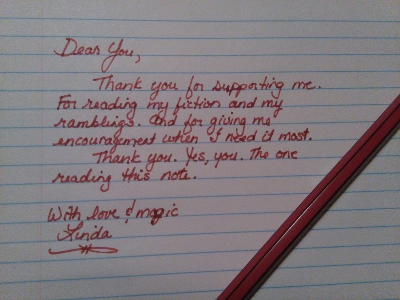 Thank you for supporting me. For reading my fiction and my ramblings. And for giving me encouragement when I need it most.
