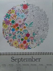 Well, I failed again to get my colouring project finished this month. It was a fun one. After all the green leaves from August’s colouring page on my calendar, I decided to go a bit crazy with the colours. I wish I’d been able to finish it.