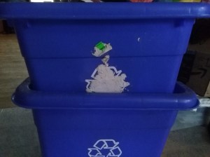 I have a lady in a puffy sleeveless dress and a spiffy hat, made unintentionally from a poorly peeled-off sticker, on the side of my recycling box.