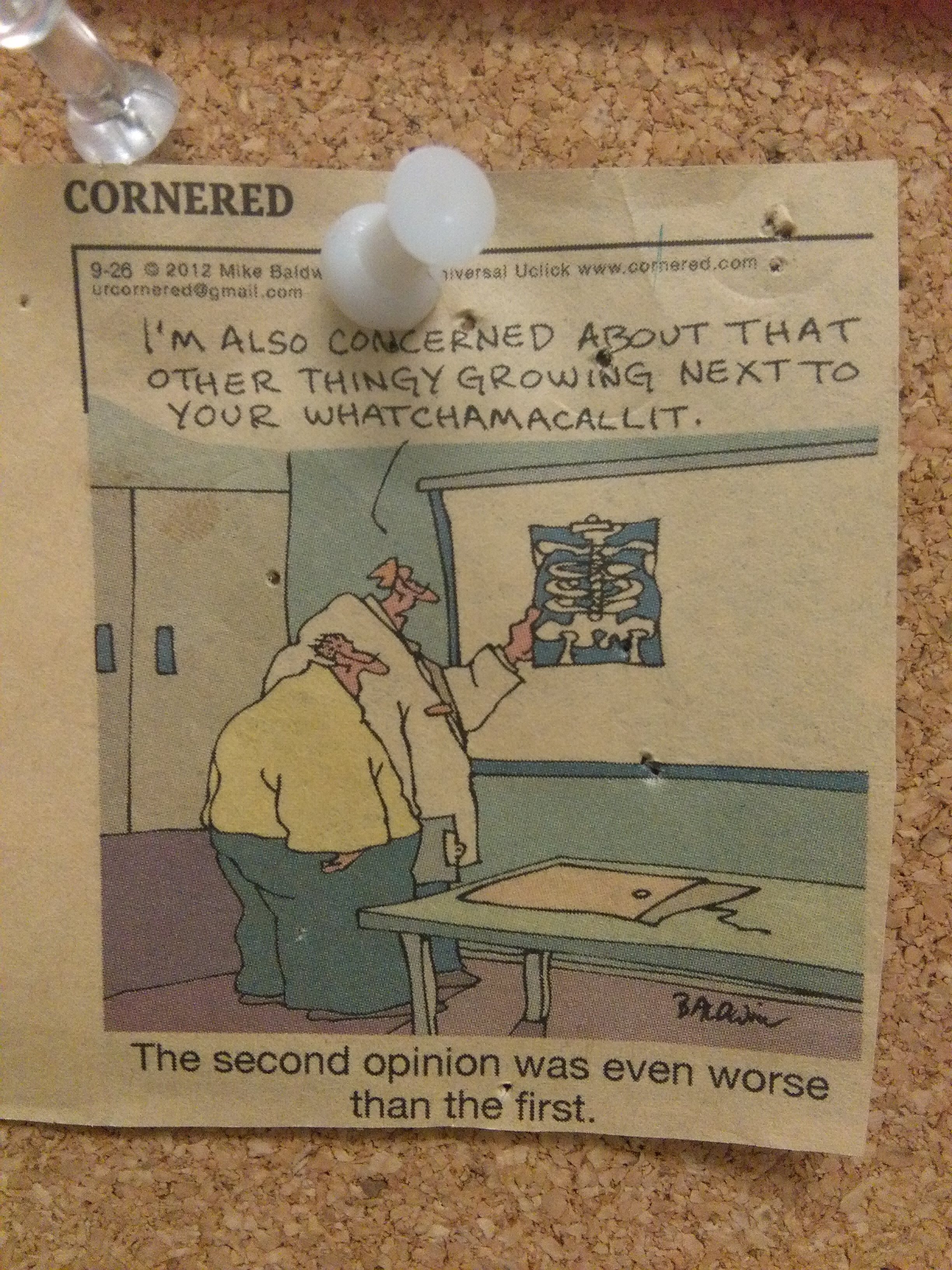 Photo depicts a cartoon of a man in a doctor’s office. The doctor is pointing at an ex-ray hanging on the wall, saying, “I’m also concerned about that other thingy growing next to your whatchamacallit.” The caption reads: The second opinion was even worse than the first.