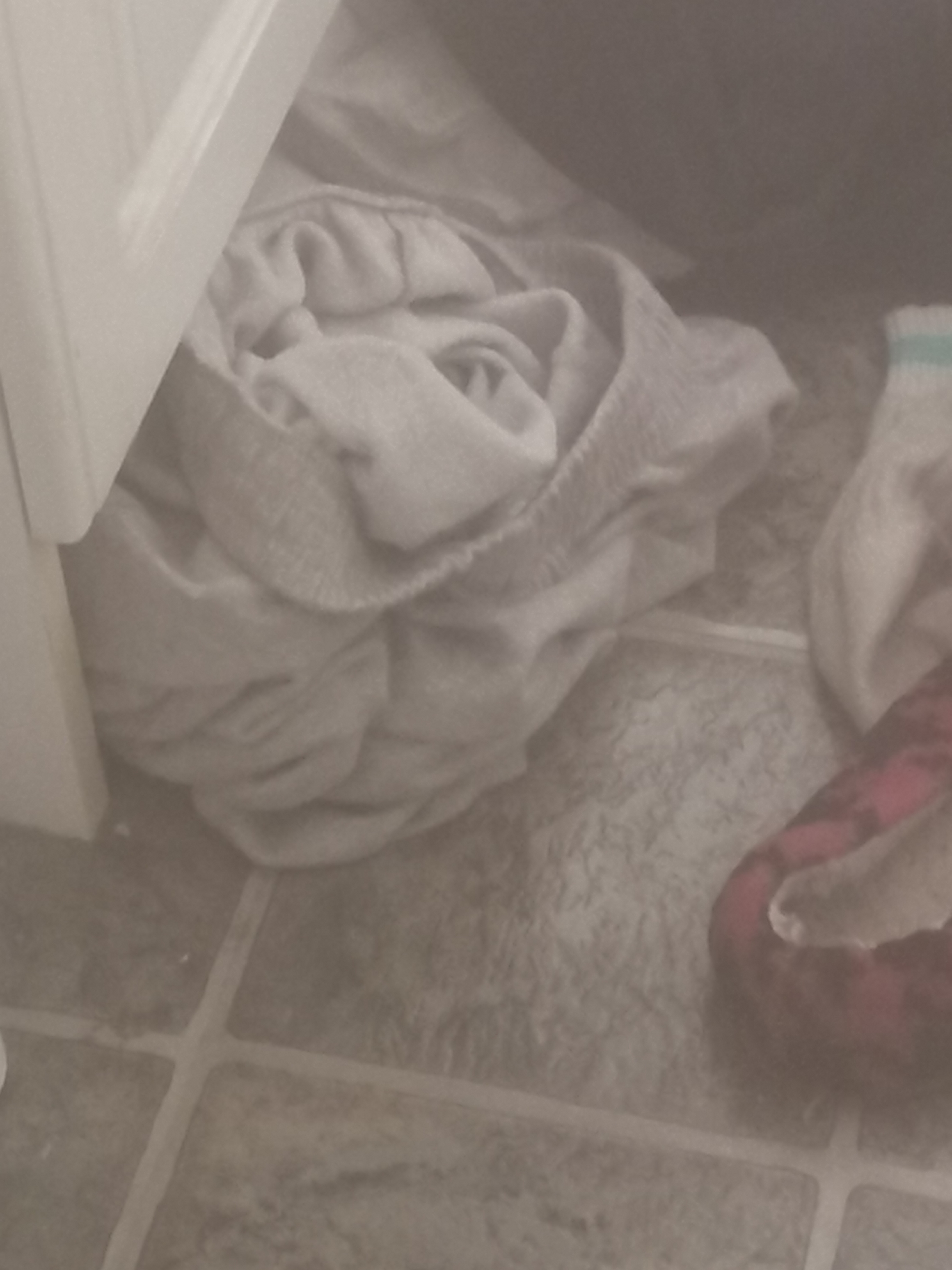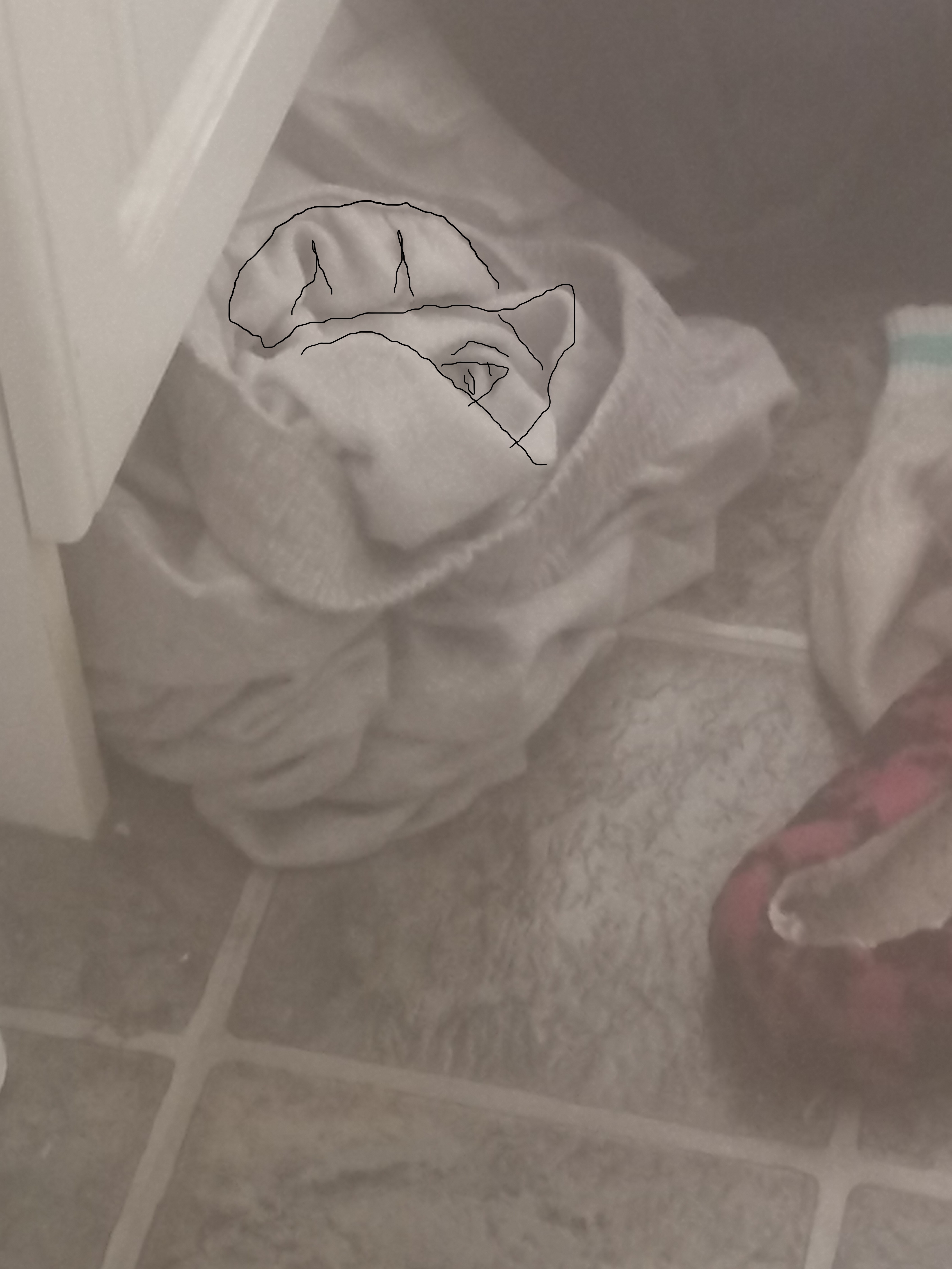 I had a shower! Yay! When I was finished, I opened the shower curtain and saw Alex’s pants where he’d left them on the floor. In the creases is the eye and one ear of a cat, with a giant paw on its head.