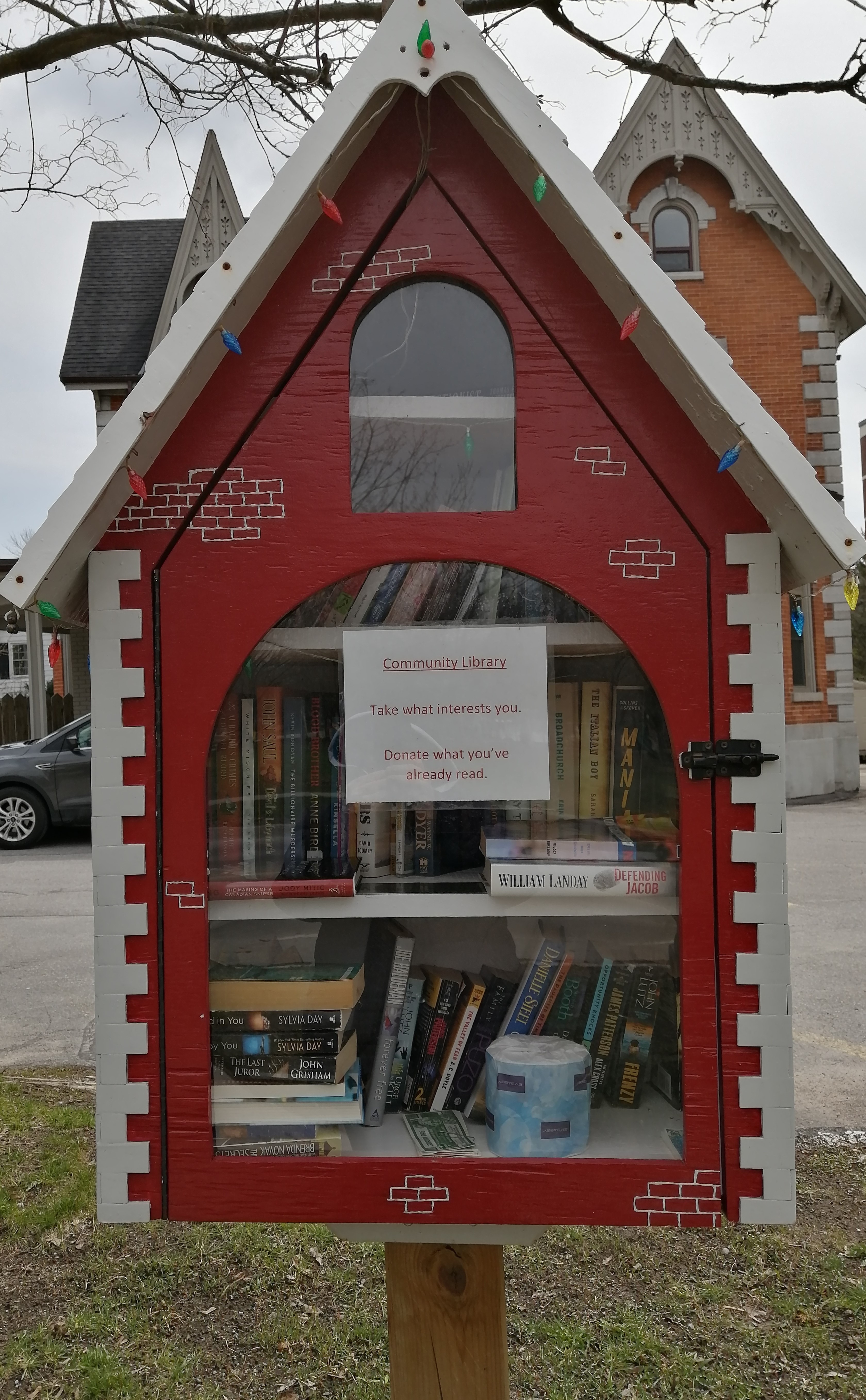Photo: A lending library with a peaked roof and a window in the door through which you can see plenty of books, a packaged roll of toilet paper, and a stack of Canadian Tire money. The library is painted red, with bricks, to look like the house that it sits in front of.