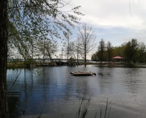Photo: A turtle pond, surrounded by trees and a narrow path beyond which is the lake. The sky was cloudy, but the blue shone through in places. On a raft in the middle of the pond are a few turtles sunning themselves.