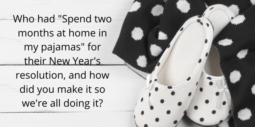 Photo: Black and white polka-dotted slippers and pjs on a white-painted wooden surface. Photo reads: Who had “Spend two months at home in my pajamas” for their New Year’s resolution, and how did you make it so we’re all doing it?