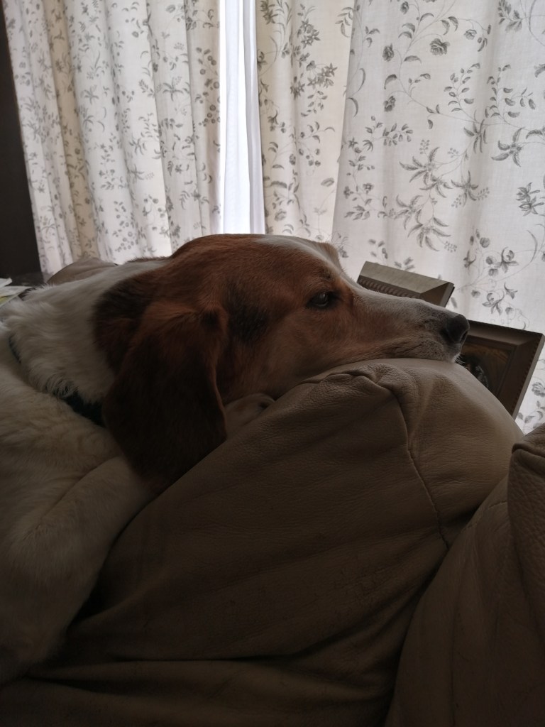 Photo: Winston, my beagle/Basset hound cross, sitting with his paws up on the back of the couch, staring dreamily out the window.
