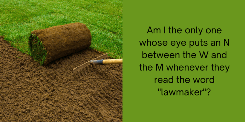 Photo: A new lawn being laid with a hoe, held by someone out of the picture, evening out the soil to roll out a roll of sod on top of it. Caption reads: “Am I the only one whose eye puts an N between the W and the M whenever they read the word “lawmaker”?