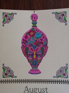 I finished my colouring my calendar page, early this month. Go me! Here’s how it started with no colour: