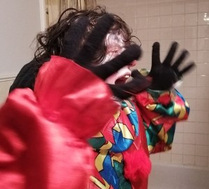 Photo: Alex, in clown makeup and costume, screaming at his reflection in the bathroom mirror. I think he actually scared himself when he first looked.