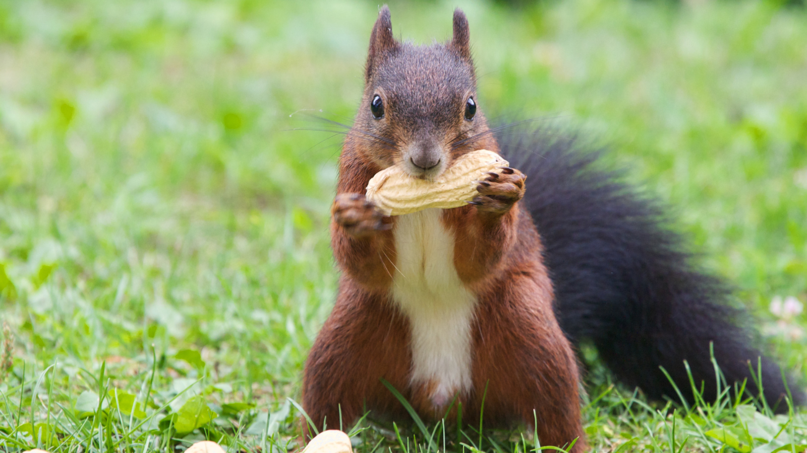 Photo: Cute red squirrel with a white belly and a fluffy black tail eating a peanut in its shell.