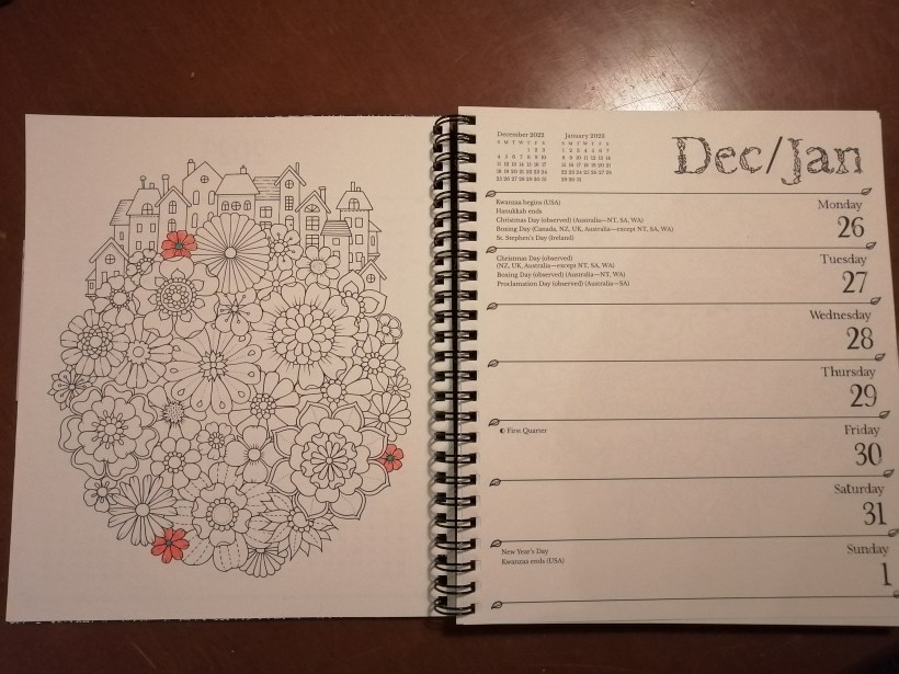 Photo: A spiral-bound book with a picture for colouring on the left-hand page and the days of the week (Monday, December 26 – Sunday, January 1) on the right-hand page.