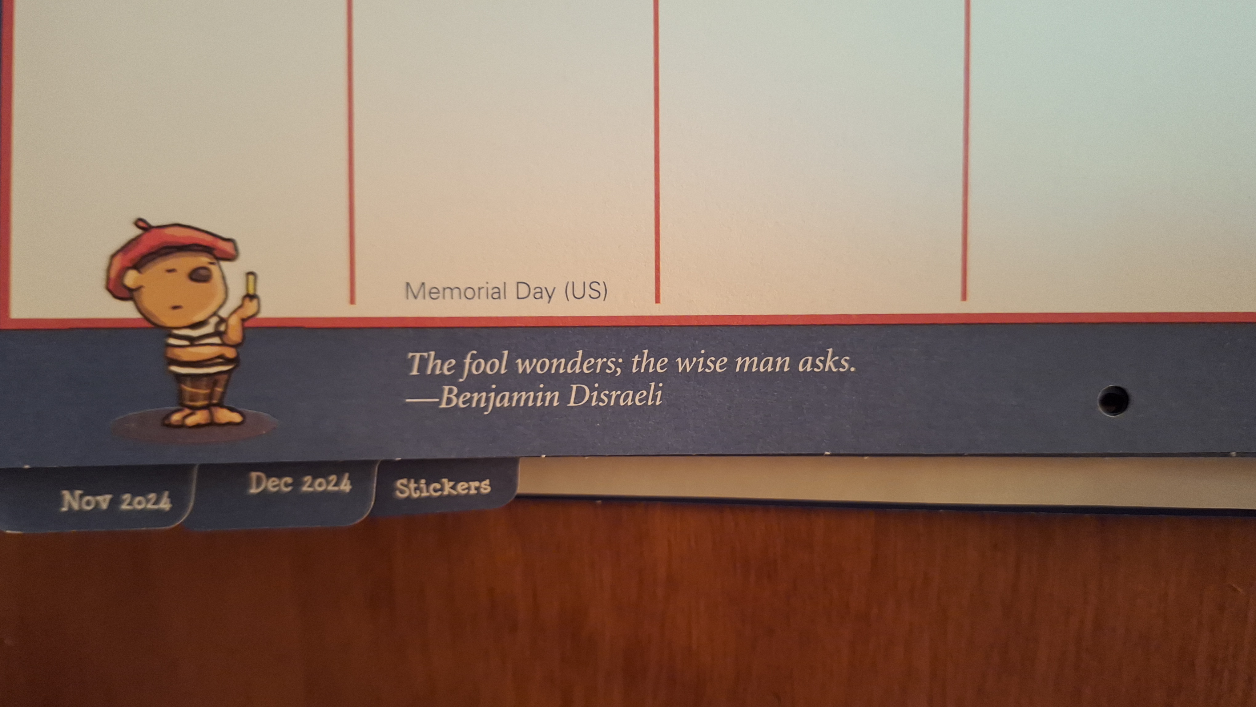 Photo: The bottom left-hand corner of my wall calendar features a cartoon of a professor-type bear with a piece of chalk his hand and the quote: “The fool wonders; the wise man asks.” ~ Benjamin Disraeli