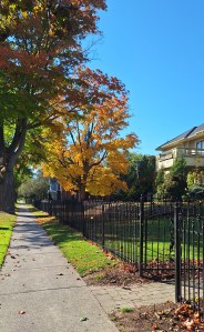 Photo 1: Tree in yellow along the sidewalk with green grass and black iron fencing and brilliant blue sky.