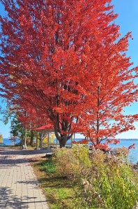 Photo 2: Trees in red along a path with the lake in the background and brilliant blue sky.