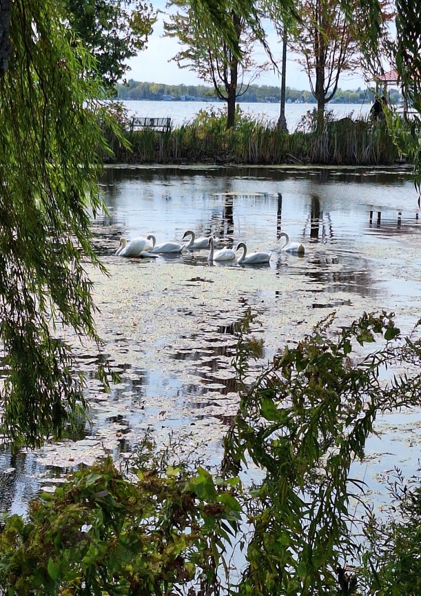 I went for a walk and saw five swans—three babies and their parents—one egret, and one shy blue heron.