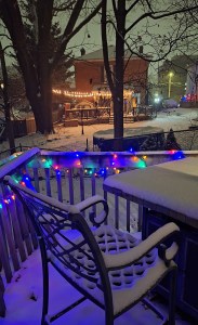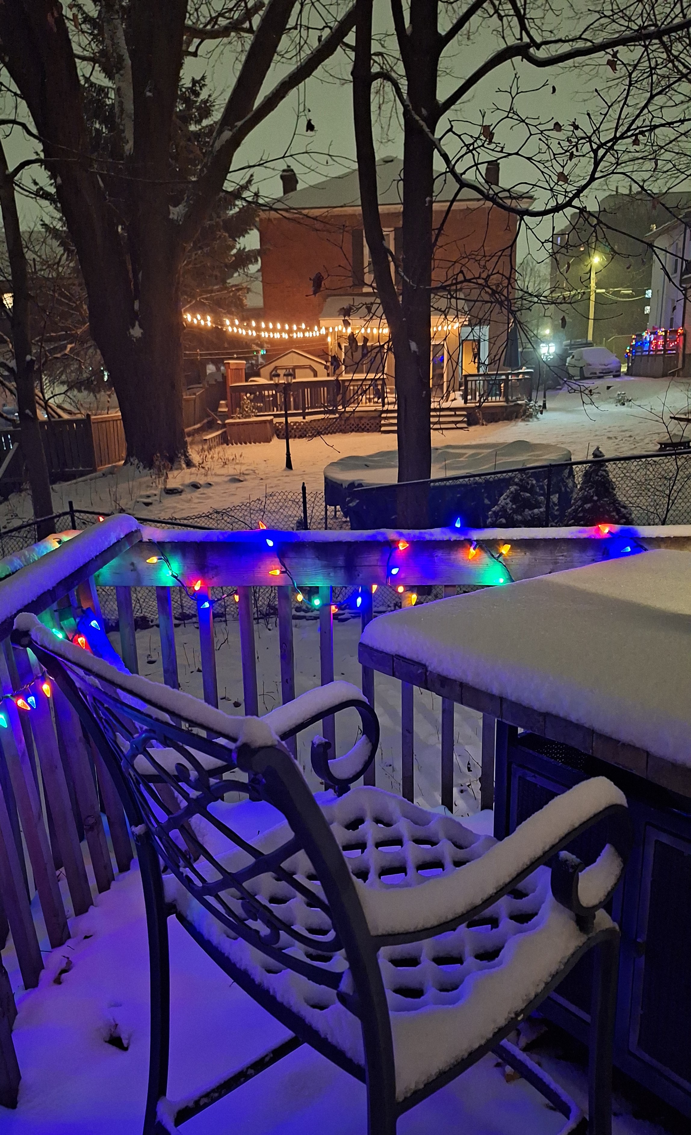 Photo: The multi-coloured Christmas lights wrapped around the top rail of my deck in my back yard that I’m seriously considering leaving there because they’re pretty.