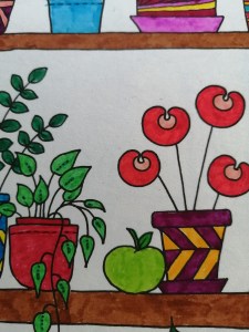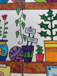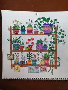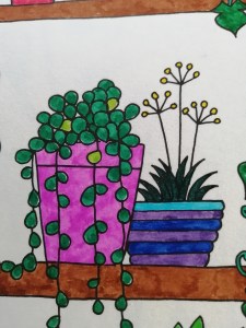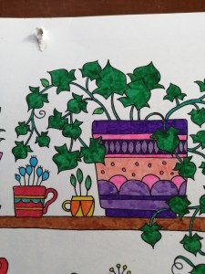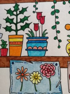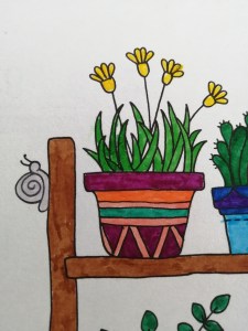 Not having time to really think about which colours to use, I just grabbed whatever. I like the overall chaos of it. Alex actually coloured the yellow flowers at the top left-hand corner, as well as half of the leaves on that plant and half of the snail before he got bored.