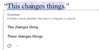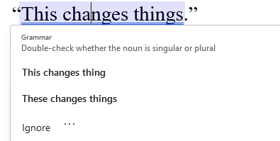 Photo: A screenshot of a quote from one of my books “This changes things.” Word doesn’t like it and suggests I change it to either “This changes thing,” or “These changes things.” What the heck, Word?