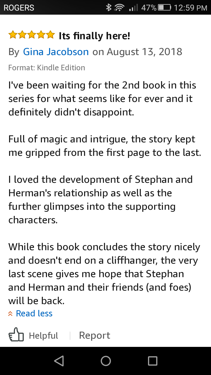 This book was great. From the wonderful characters, to the amazingly believable unbelievable story line. Confused? Well, although we all know magic isn’t real, the author makes it all make sense. This story about a young woman, Herman, and the man she meets. He is trying to break a curse that was placed on his family. i feel like i would be giving away spoilers by continuing. So, just read the book and you won’t be disappointed. The only complaint i have is I wanted to continue reading the next story now. ~ 4 Stars – hlee, Amazon.com
