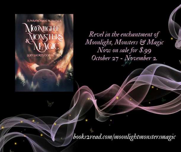 The new anthology, Moonlight, Monsters & Magic, is also on sale for just 99¢! It’s a great compilation of 13 paranormal romance stories, each about 25 pages in length. Included is my cute but sexy romance tale, “Pixie.”