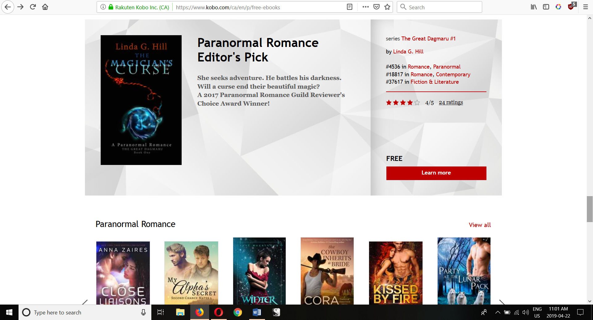 This book was great. From the wonderful characters, to the amazingly believable unbelievable story line. Confused? Well, although we all know magic isn’t real, the author makes it all make sense. This story about a young woman, Herman, and the man she meets. He is trying to break a curse that was placed on his family. i feel like i would be giving away spoilers by continuing. So, just read the book and you won’t be disappointed. The only complaint i have is I wanted to continue reading the next story now. ~ 4 Stars – hlee, Amazon.com