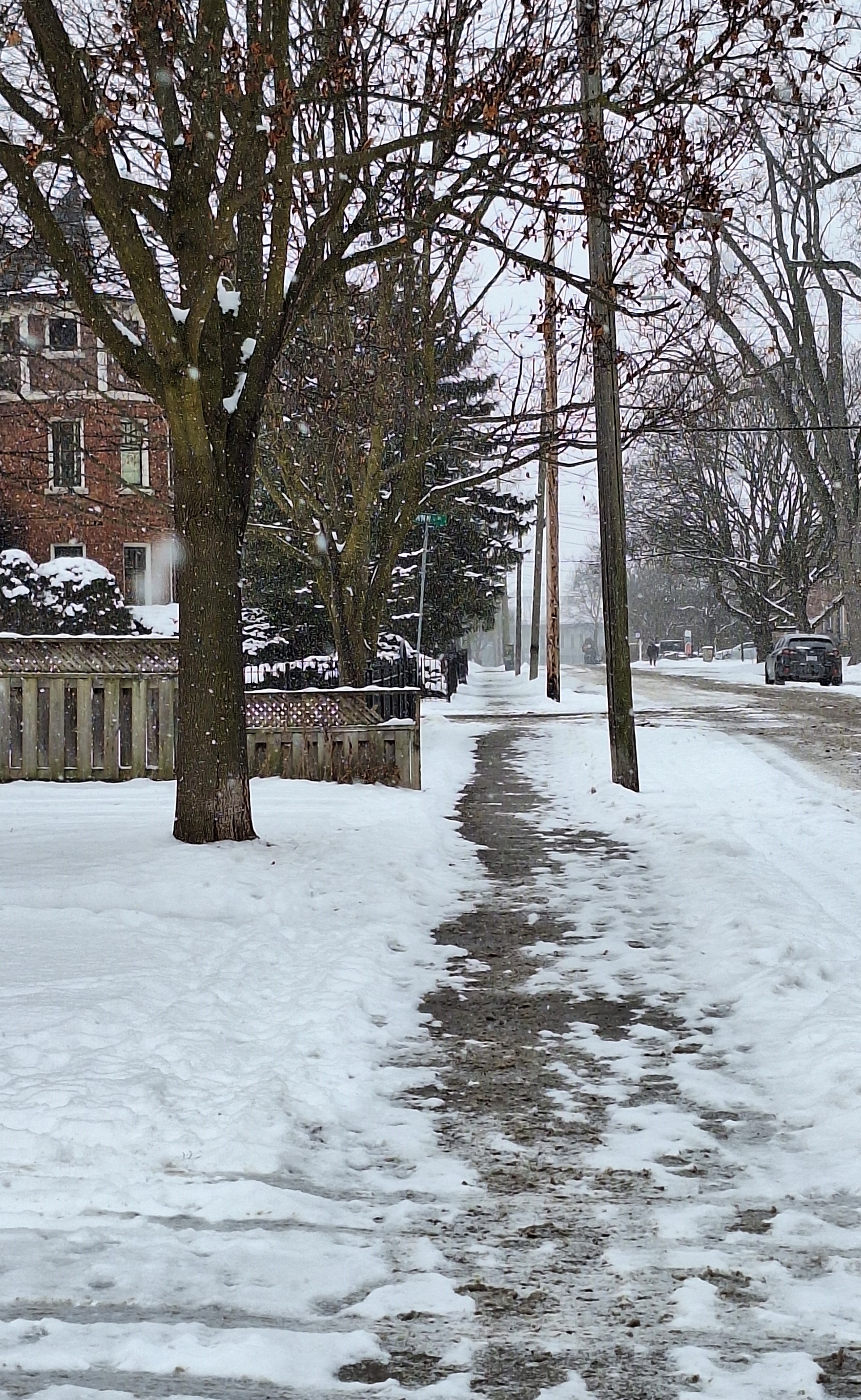 Photo: A snowy sidewalk stretching off into the distance with the road on the right side of the frame and houses, fences, and trees on the left. The snow is falling gently.