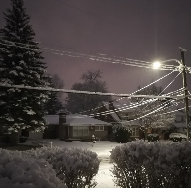 The snow piles up on the hydro wires.