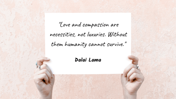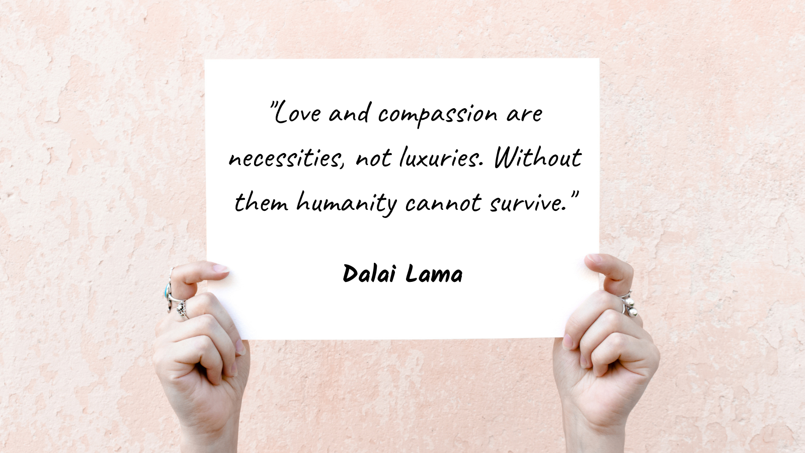 Photo: Two hands holding up a sign that says, “Love and compassion are necessities, not luxuries. Without them humanity cannot survive.” – Dalai Lama