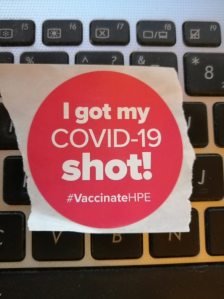 Photo: My red “I got my COVID-19 shot!” sticker sitting on the keyboard of my laptop.