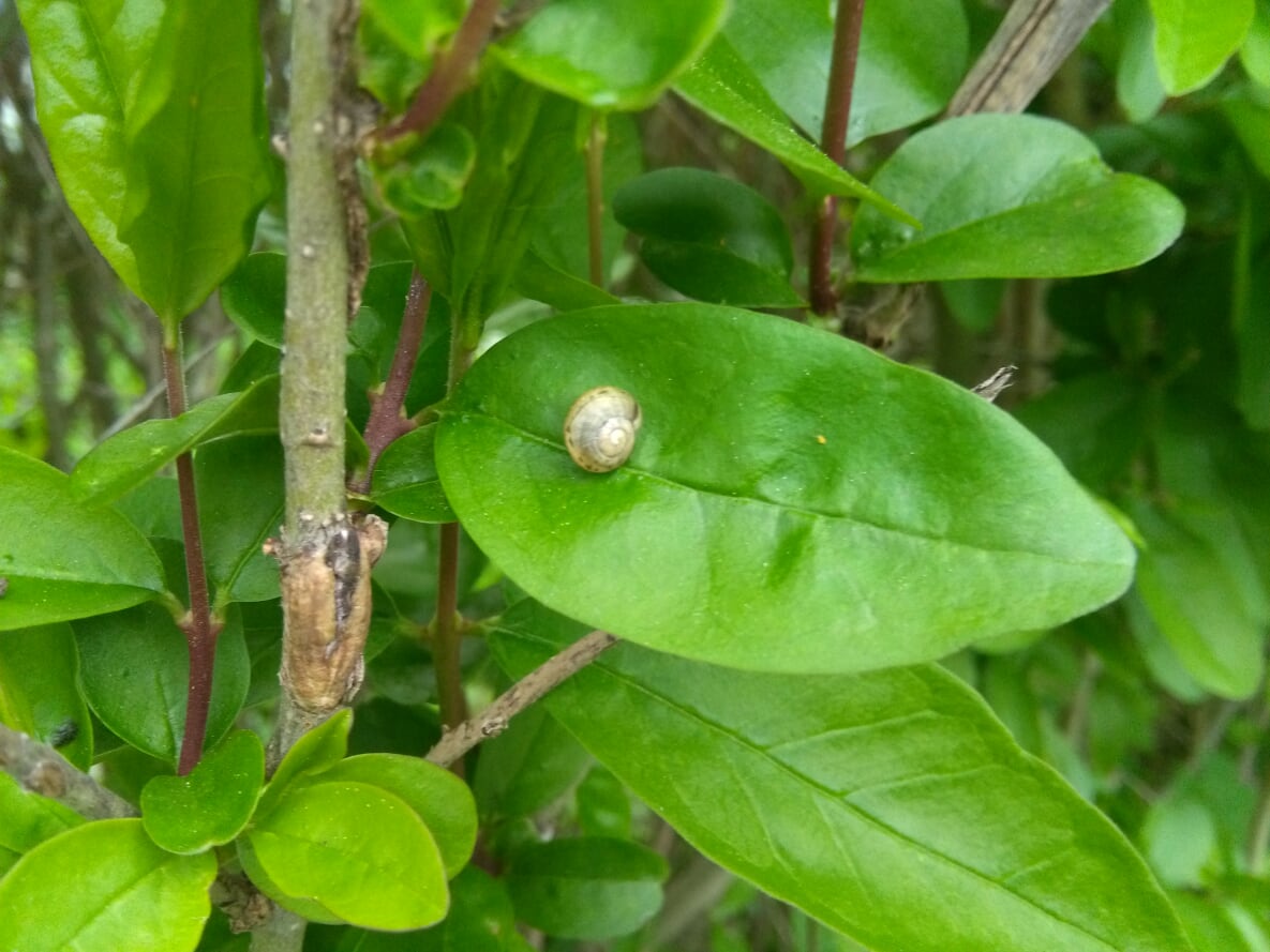 (Photos depict a tiny snail on a leaf that’s about three feet off the ground, in a hedge.)