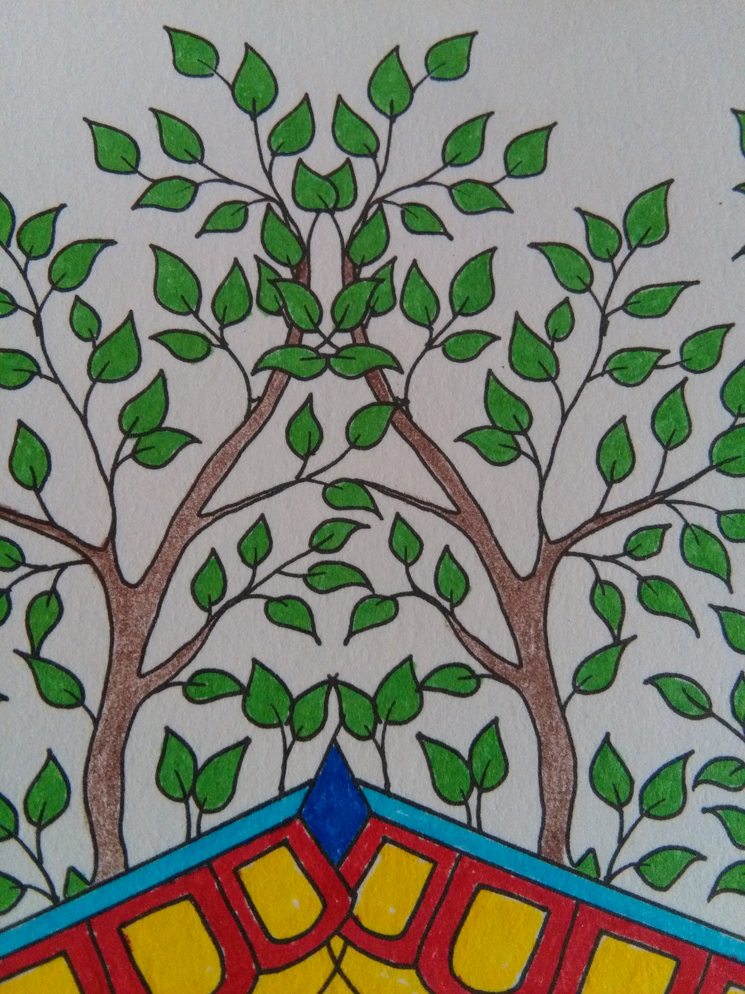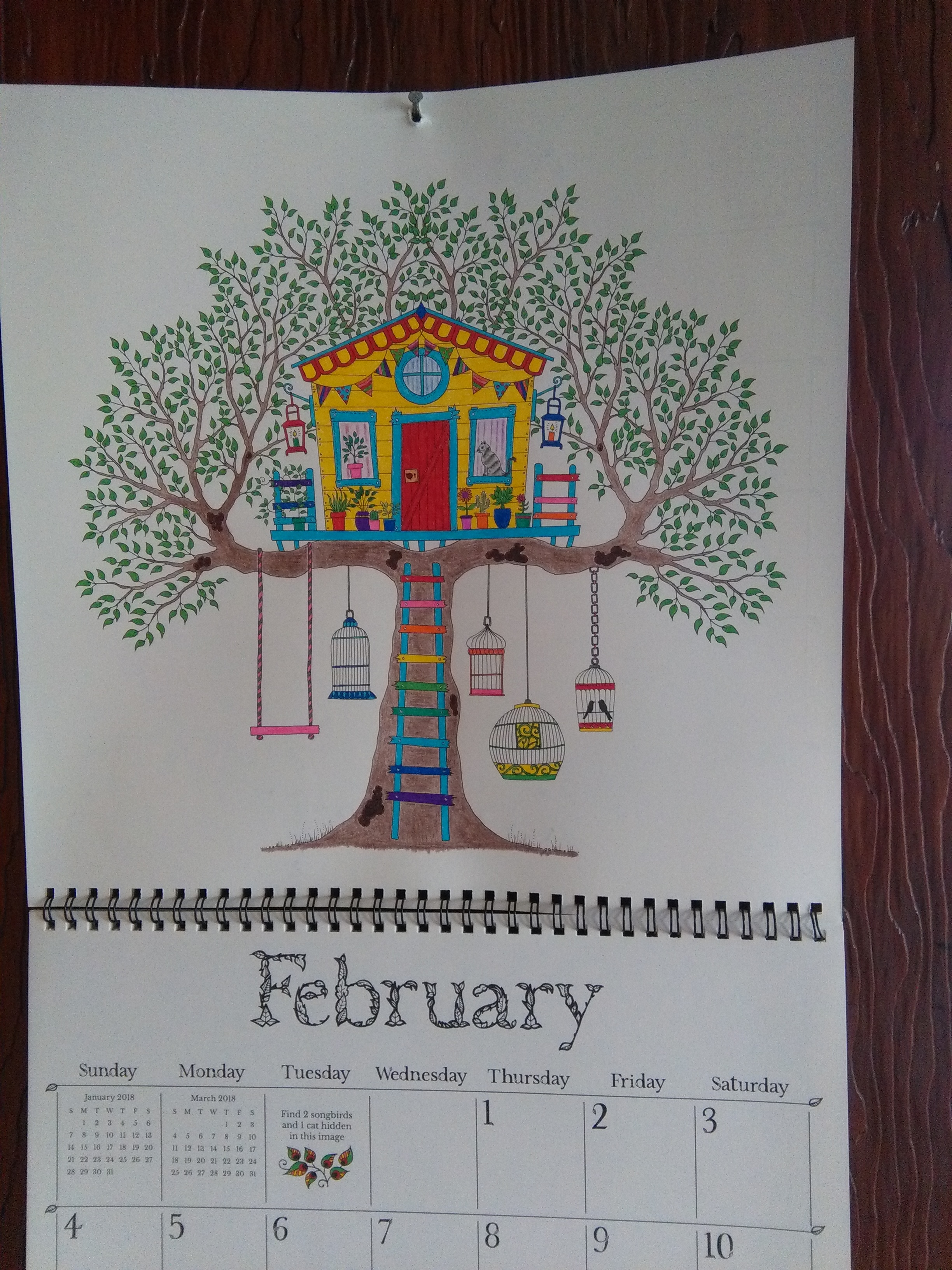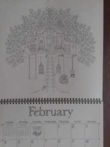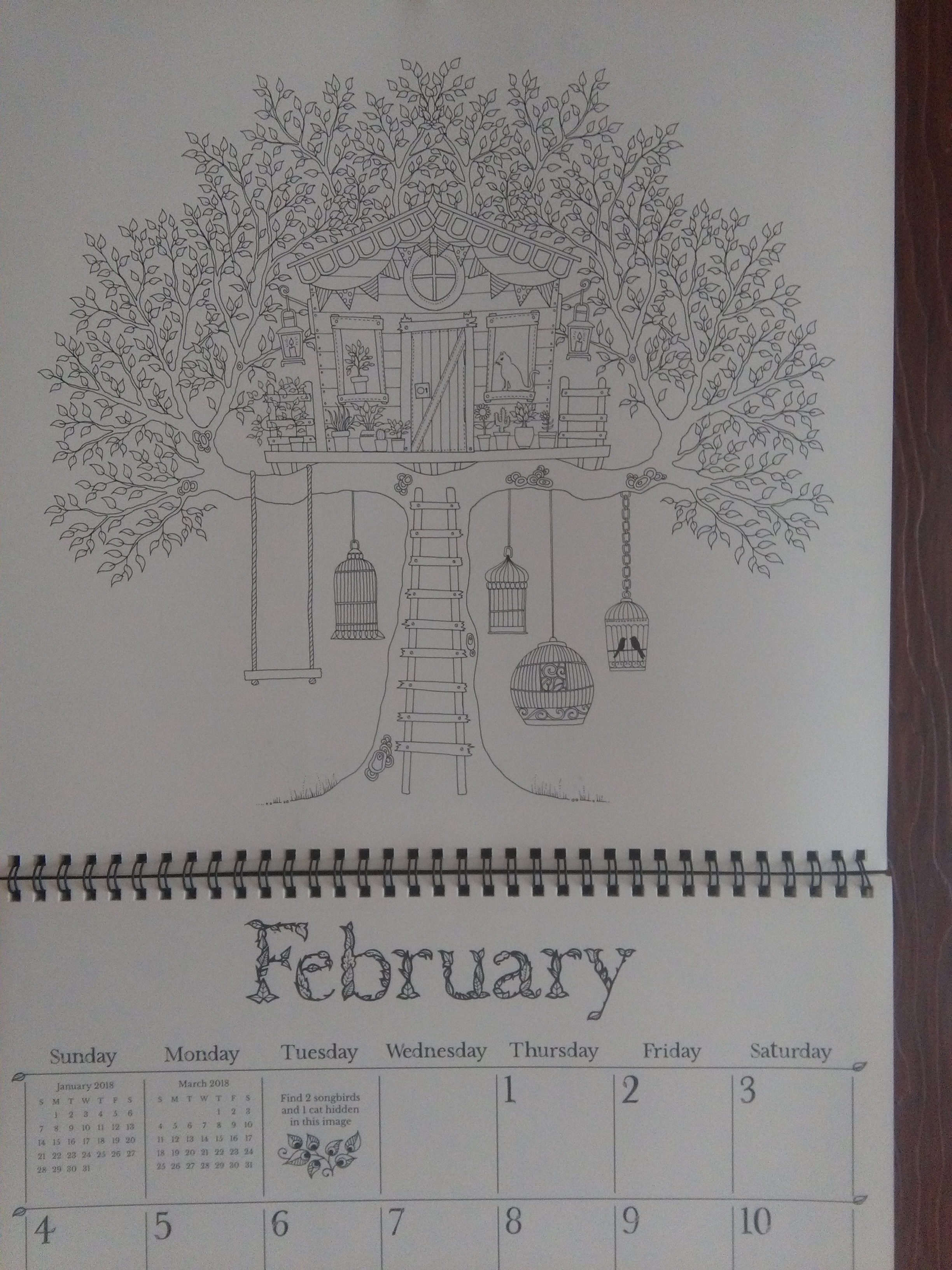 My reaction when I first saw the February page of my calendar was an overwhelmed “that’s a lot of leaves.” But I knew I was in for a challenge with most of the months when I bought the thing, so I sat down and started. I coloured the leaves first, to get them out of the way.