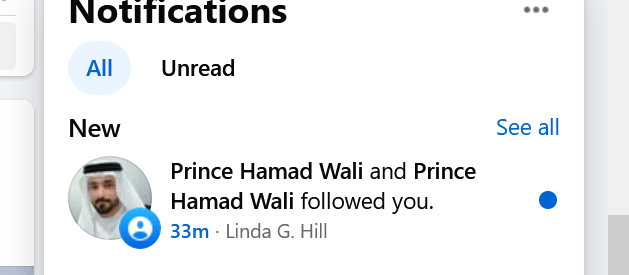 Photo: A Facebook notification telling me “Prince Hamad Wali” and “Prince Hamad Wali” followed my author page. Yes, two different profiles.