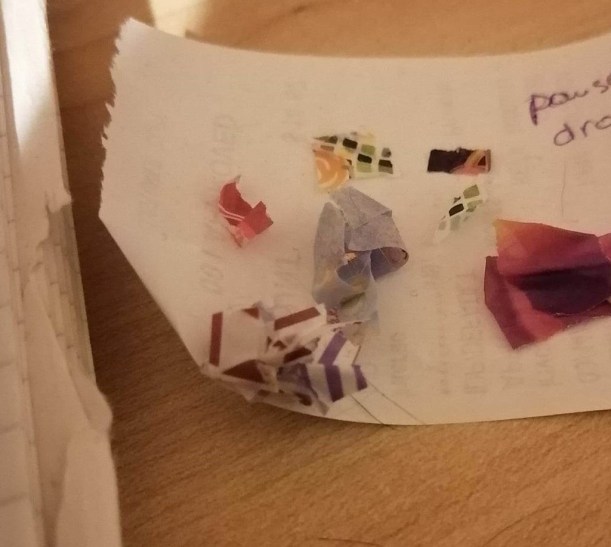 I’ve been using washi tape (decorative masking tape) to decorate my calendars. When I get a bit that doesn’t go where I want it to, I stick it to the back of an old receipt. Somehow, I created a man in a gray coat and a hat with green squares, purely by accident.